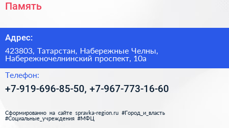Память по адресу 423803, Татарстан, Набережные Челны, Набережночелнинский проспект, 10а в дальнейшем Организация, размещена в следующих категориях: