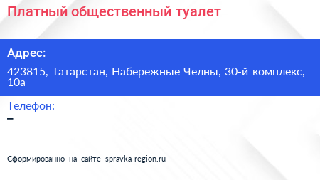 Платный общественный туалет по адресу 423815, Татарстан, Набережные Челны, 30-й комплекс, 10а в дальнейшем Организация, размещена в следующих категориях: