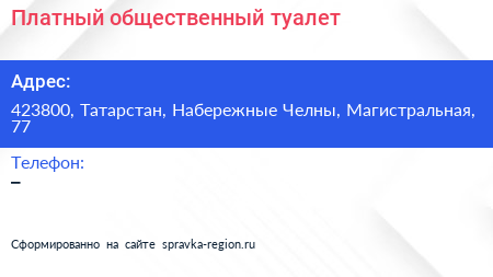 Платный общественный туалет по адресу 423800, Татарстан, Набережные Челны, Магистральная, 77 в дальнейшем Организация, размещена в следующих категориях: