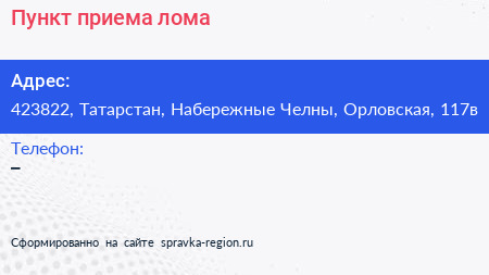 Пункт приема лома по адресу 423822, Татарстан, Набережные Челны, Орловская, 117в в дальнейшем Организация, размещена в следующих категориях: