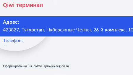 Qiwi, терминал по адресу 423827, Татарстан, Набережные Челны, 26-й комплекс, 10 в дальнейшем Организация, размещена в следующих категориях: