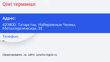 Qiwi, терминал по адресу 423800, Татарстан, Набережные Челны, Металлургическая, 31 в дальнейшем Организация, размещена в следующих категориях: