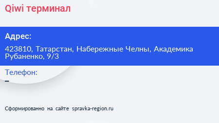 Qiwi, терминал по адресу 423810, Татарстан, Набережные Челны, Академика Рубаненко, 9/3 в дальнейшем Организация, размещена в следующих категориях: