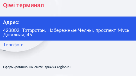 Qiwi, терминал по адресу 423802, Татарстан, Набережные Челны, проспект Мусы Джалиля, 45 в дальнейшем Организация, размещена в следующих категориях: