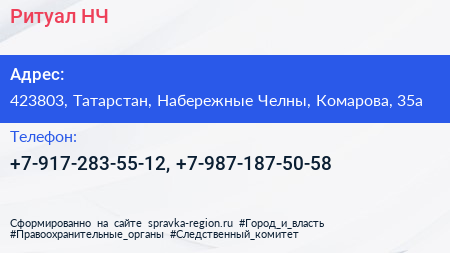 Ритуал-НЧ по адресу 423803, Татарстан, Набережные Челны, Комарова, 35а в дальнейшем Организация, размещена в следующих категориях: