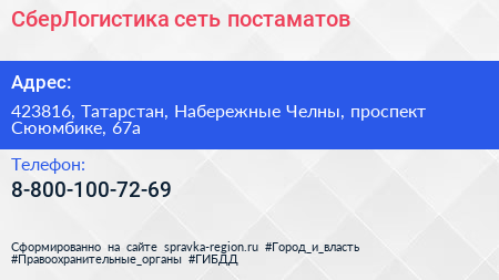 СберЛогистика, сеть постаматов по адресу 423816, Татарстан, Набережные Челны, проспект Сююмбике, 67а в дальнейшем Организация, размещена в следующих категориях: