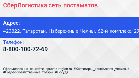 СберЛогистика, сеть постаматов по адресу 423822, Татарстан, Набережные Челны, 62-й комплекс, 29 в дальнейшем Организация, размещена в следующих категориях:
