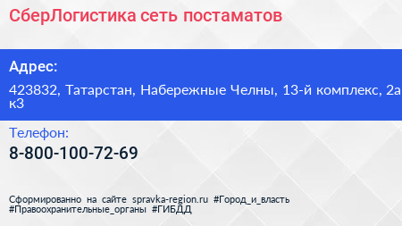 СберЛогистика, сеть постаматов по адресу 423832, Татарстан, Набережные Челны, 13-й комплекс, 2а к3 в дальнейшем Организация, размещена в следующих категориях: