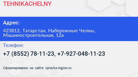 TEHNIKACHELNY по адресу 423812, Татарстан, Набережные Челны, Машиностроительная, 12а в дальнейшем Организация, размещена в следующих категориях: