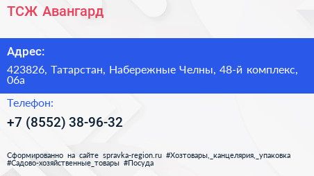 ТСЖ Авангард по адресу 423826, Татарстан, Набережные Челны, 48-й комплекс, 06а в дальнейшем Организация, размещена в следующих категориях:
