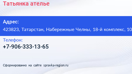 Татьянка, ателье по адресу 423823, Татарстан, Набережные Челны, 18-й комплекс, 10 в дальнейшем Организация, размещена в следующих категориях: