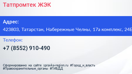 Татпромтек, ЖЭК по адресу 423803, Татарстан, Набережные Челны, 17а комплекс, 24Б в дальнейшем Организация, размещена в следующих категориях: