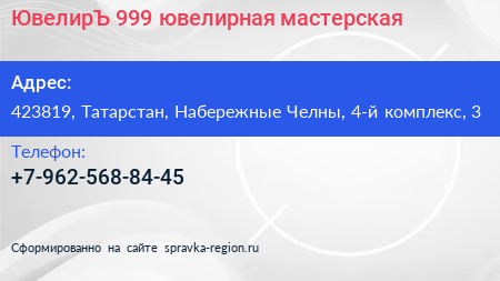 ЮвелирЪ 999, ювелирная мастерская по адресу 423819, Татарстан, Набережные Челны, 4-й комплекс, 3 в дальнейшем Организация, размещена в следующих категориях: