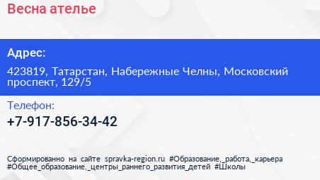 Весна, ателье по адресу 423819, Татарстан, Набережные Челны, Московский проспект, 129/5 в дальнейшем Организация, размещена в следующих категориях: