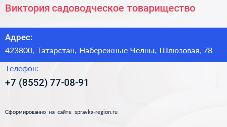 Виктория, садоводческое товарищество по адресу 423800, Татарстан, Набережные Челны, Шлюзовая, 78 в дальнейшем Организация, размещена в следующих категориях: