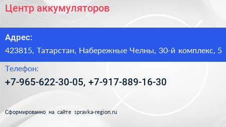 Центр аккумуляторов по адресу 423815, Татарстан, Набережные Челны, 30-й комплекс, 5 в дальнейшем Организация, размещена в следующих категориях:
