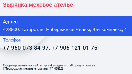 Зырянка, меховое ателье по адресу 423800, Татарстан, Набережные Челны, 4-й комплекс, 1 в дальнейшем Организация, размещена в следующих категориях: