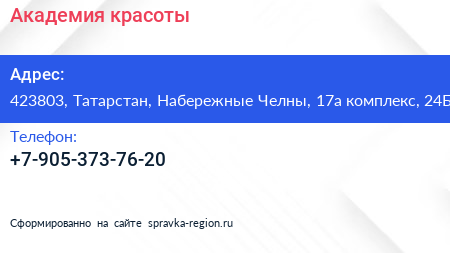 Академия красоты по адресу 423803, Татарстан, Набережные Челны, 17а комплекс, 24Б в дальнейшем Организация, размещена в следующих категориях: