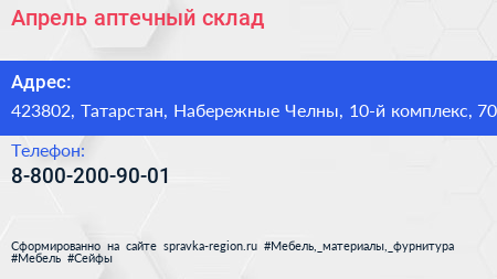 Апрель, аптечный склад по адресу 423802, Татарстан, Набережные Челны, 10-й комплекс, 70 в дальнейшем Организация, размещена в следующих категориях: