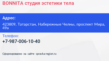 BONNITA, студия эстетики тела по адресу 423809, Татарстан, Набережные Челны, проспект Мира, 49а в дальнейшем Организация, размещена в следующих категориях: