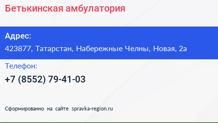 Бетькинская амбулатория по адресу 423877, Татарстан, Набережные Челны, Новая, 2а в дальнейшем Организация, размещена в следующих категориях: