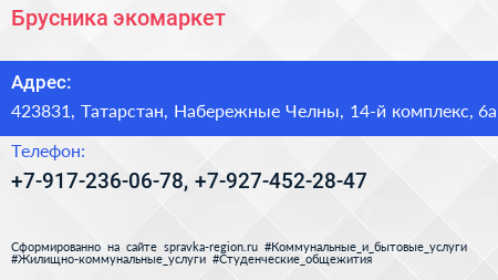 Брусника, экомаркет по адресу 423831, Татарстан, Набережные Челны, 14-й комплекс, 6а в дальнейшем Организация, размещена в следующих категориях: