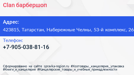 Clan, барбершоп по адресу 423815, Татарстан, Набережные Челны, 53-й комплекс, 26 в дальнейшем Организация, размещена в следующих категориях:
