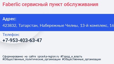 Faberlic, сервисный пункт обслуживания по адресу 423832, Татарстан, Набережные Челны, 13-й комплекс, 16 в дальнейшем Организация, размещена в следующих категориях: