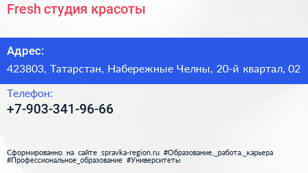 Fresh, студия красоты по адресу 423803, Татарстан, Набережные Челны, 20-й квартал, 02 в дальнейшем Организация, размещена в следующих категориях: