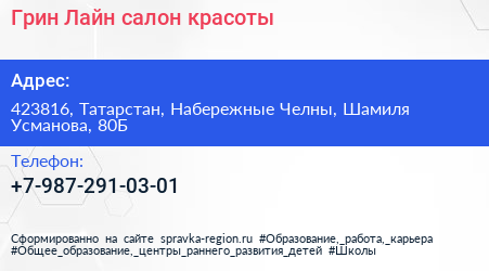 Грин Лайн, салон красоты по адресу 423816, Татарстан, Набережные Челны, Шамиля Усманова, 80Б в дальнейшем Организация, размещена в следующих категориях: