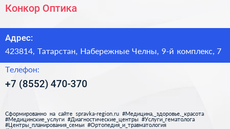 Конкор-Оптика по адресу 423814, Татарстан, Набережные Челны, 9-й комплекс, 7 в дальнейшем Организация, размещена в следующих категориях: