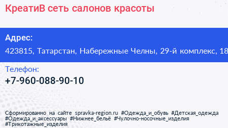 КреатиВ, сеть салонов красоты по адресу 423815, Татарстан, Набережные Челны, 29-й комплекс, 18 в дальнейшем Организация, размещена в следующих категориях: