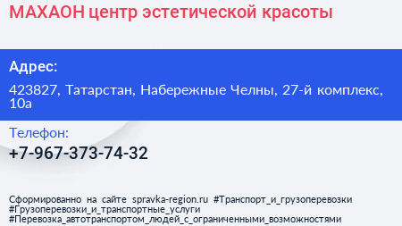 МАХАОН, центр эстетической красоты по адресу 423827, Татарстан, Набережные Челны, 27-й комплекс, 10а в дальнейшем Организация, размещена в следующих категориях: