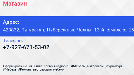 Магазин по адресу 423832, Татарстан, Набережные Челны, 13-й комплекс, 15 в дальнейшем Организация, размещена в следующих категориях: