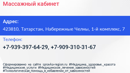 Массажный кабинет по адресу 423810, Татарстан, Набережные Челны, 1-й комплекс, 7 в дальнейшем Организация, размещена в следующих категориях: