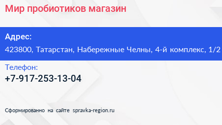 Мир пробиотиков, магазин по адресу 423800, Татарстан, Набережные Челны, 4-й комплекс, 1/2 в дальнейшем Организация, размещена в следующих категориях: