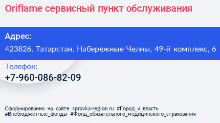 Oriflame, сервисный пункт обслуживания по адресу 423826, Татарстан, Набережные Челны, 49-й комплекс, 6 в дальнейшем Организация, размещена в следующих категориях: