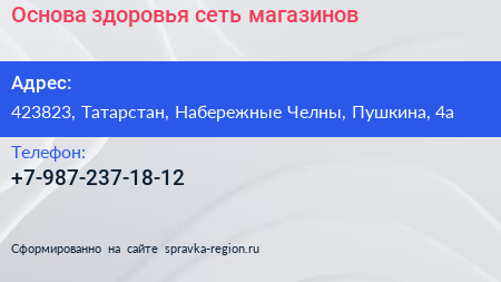 Основа здоровья, сеть магазинов по адресу 423823, Татарстан, Набережные Челны, Пушкина, 4а в дальнейшем Организация, размещена в следующих категориях: