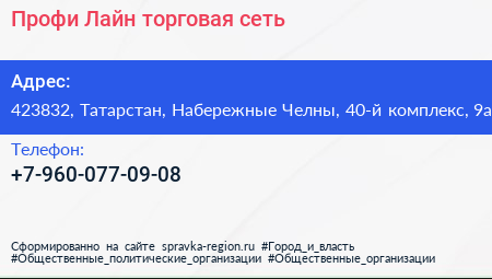 Профи Лайн, торговая сеть по адресу 423832, Татарстан, Набережные Челны, 40-й комплекс, 9а в дальнейшем Организация, размещена в следующих категориях: