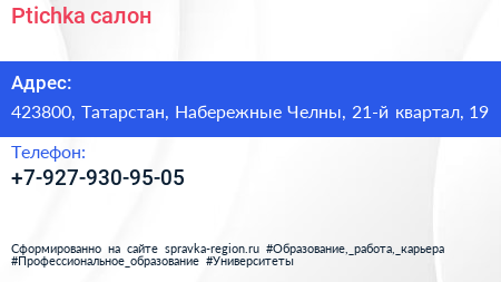 Ptichka, салон по адресу 423800, Татарстан, Набережные Челны, 21-й квартал, 19 в дальнейшем Организация, размещена в следующих категориях: