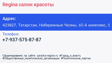 Regina, салон красоты по адресу 423827, Татарстан, Набережные Челны, 65-й комплекс, 1 в дальнейшем Организация, размещена в следующих категориях: