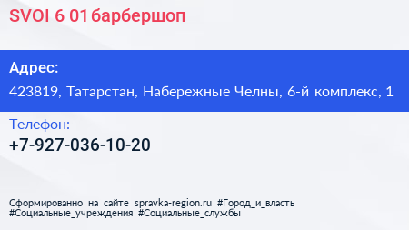 SVOI 6/01, барбершоп по адресу 423819, Татарстан, Набережные Челны, 6-й комплекс, 1 в дальнейшем Организация, размещена в следующих категориях: