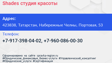 Shades, студия красоты по адресу 423838, Татарстан, Набережные Челны, Портовая, 53 в дальнейшем Организация, размещена в следующих категориях: