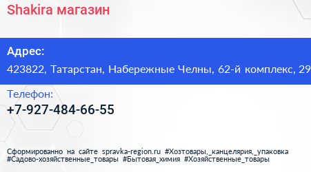 Shakira, магазин по адресу 423822, Татарстан, Набережные Челны, 62-й комплекс, 29 в дальнейшем Организация, размещена в следующих категориях: