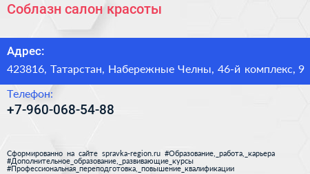 Соблазн, салон красоты по адресу 423816, Татарстан, Набережные Челны, 46-й комплекс, 9 в дальнейшем Организация, размещена в следующих категориях: