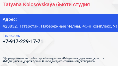 Tatyana Kolosovskaya, бьюти-студия по адресу 423832, Татарстан, Набережные Челны, 40-й комплекс, 9а в дальнейшем Организация, размещена в следующих категориях:
