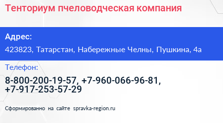 Тенториум, пчеловодческая компания по адресу 423823, Татарстан, Набережные Челны, Пушкина, 4а в дальнейшем Организация, размещена в следующих категориях: