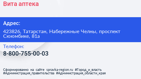 Вита, аптека по адресу 423826, Татарстан, Набережные Челны, проспект Сююмбике, 81а в дальнейшем Организация, размещена в следующих категориях:
