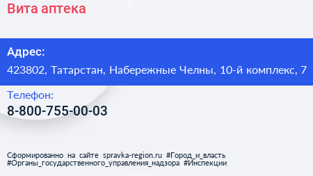 Вита, аптека по адресу 423802, Татарстан, Набережные Челны, 10-й комплекс, 7 в дальнейшем Организация, размещена в следующих категориях: