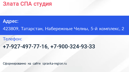 Злата, СПА-студия по адресу 423809, Татарстан, Набережные Челны, 5-й комплекс, 2 в дальнейшем Организация, размещена в следующих категориях:
